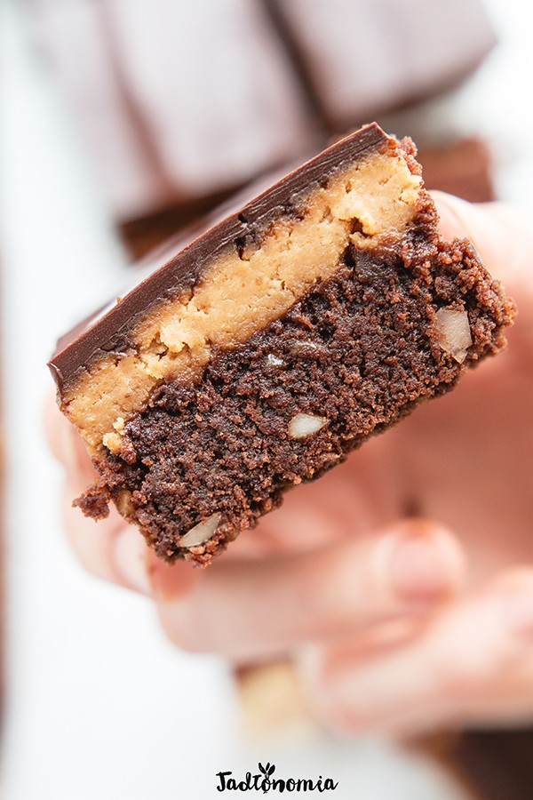 Pamiętacie brownie, o którym pisałam niedawno, a które pokochało już tak wiele osób? Do receptury na to ciasto użyłam właśnie przepisu na poczciwe brownie. Jednak tym razem ciasto piekę w dużej foremce, dzięki czemu czekoladowa warstwa jest znacznie cieńsza i na nią mogę wylać rozbrajająco dobry mus z masła orzechowego i kaszy jaglanej, a jakby jeszcze tego było mało wszystko przykrywam czekoladową polewą. Tak rozpustnego, a jednocześnie prostego ciasta nie robiłam od dawna.