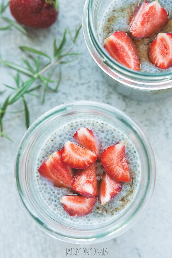 Podstawowy przepis na pudding chia znajdziecie tutaj, ale jeśli macie wolną chwilę, możecie mi zaufać i trochę pokombinować. Wieczór przed podaniem deseru wystarczy zagotować mleko z gałązką rozmarynu, kilkoma ziarnami pieprzu oraz syropem klonowym, a następnie odstawić je na godzinę do wystudzenia. Po tym czasie już tylko należy mleko odcedzić, wymieszać z ziarnami i włożyć do lodówki – rano wyjmiecie prawdziwy rarytas, czyli rozmarynowy pudding chia, który najlepiej smakuje z mnóstwem świeżych truskawek.