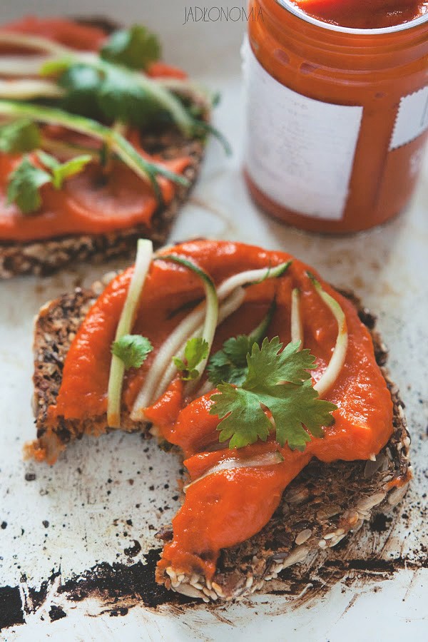 Ajvar to kanapkowa podstawa wszystkich wegan: dostępny przez cały rok, w każdym sklepie i za przystępną cenę. Ale w sierpniu zamiast sięgać po ten sklepowy, lepiej jest zrobić swój własny dodając ulubione warzywa w dowolnych proporcjach. Czasem można dorzucić więcej papryki, innym razem postawić na bakłażany lub zaszaleć z pomidorami. Jednak największą frajdą jest doprawienie ajvaru w zupełnie nowy sposób – tym razem sięgnęłam po dodatek pieczonej piżmowej dyni, srirachy, soku z limonek oraz pachnącego, słodkiego oleju arachidowego. I chociaż wiem, że klasyczny ajvar tyle razy uratował mnie od śmierci głodowej, że powinnam być mu dozgonnie wdzięczna, to jednak na moment z nim zrywam – dyniowa wersja całkiem zawróciła mi w głowie.