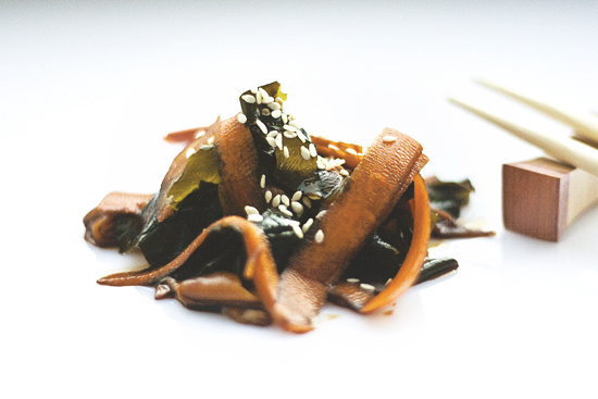 2. Wodorosty zalewamy zimną wodą i odstawiamy przynajmniej na 10 minut. Glony dokładnie odcedzamy i kroimy je na kilka mniejszych kawałków, dodajemy zamarynowaną marchewkę i imbir. Nie wylewamy zalewy z marchewek.