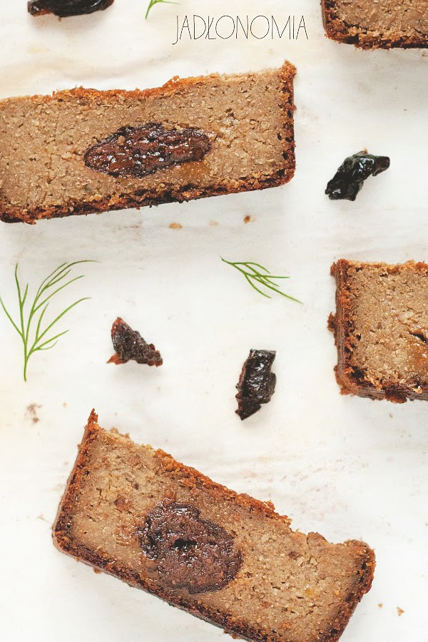Ten pasztet podobnie jak żurawinowy przygotowany jest na bazie soczewicy i kaszy jaglanej, dzięki czemu jest bezglutenowy i bardzo prosty w przygotowaniu. Jednak dodatek suszonej śliwki sprawia, że ma bardzo słodki, głęboki aromat – ważne jest, żeby śliwki nie ciąć na kawałki, a podobnie jak na zdjęciach poniżej ułożyć całe śliwki w przekroju pasztetu. Dzięki temu każdy plaster ma w środku słodki, śliwkowy kęs.