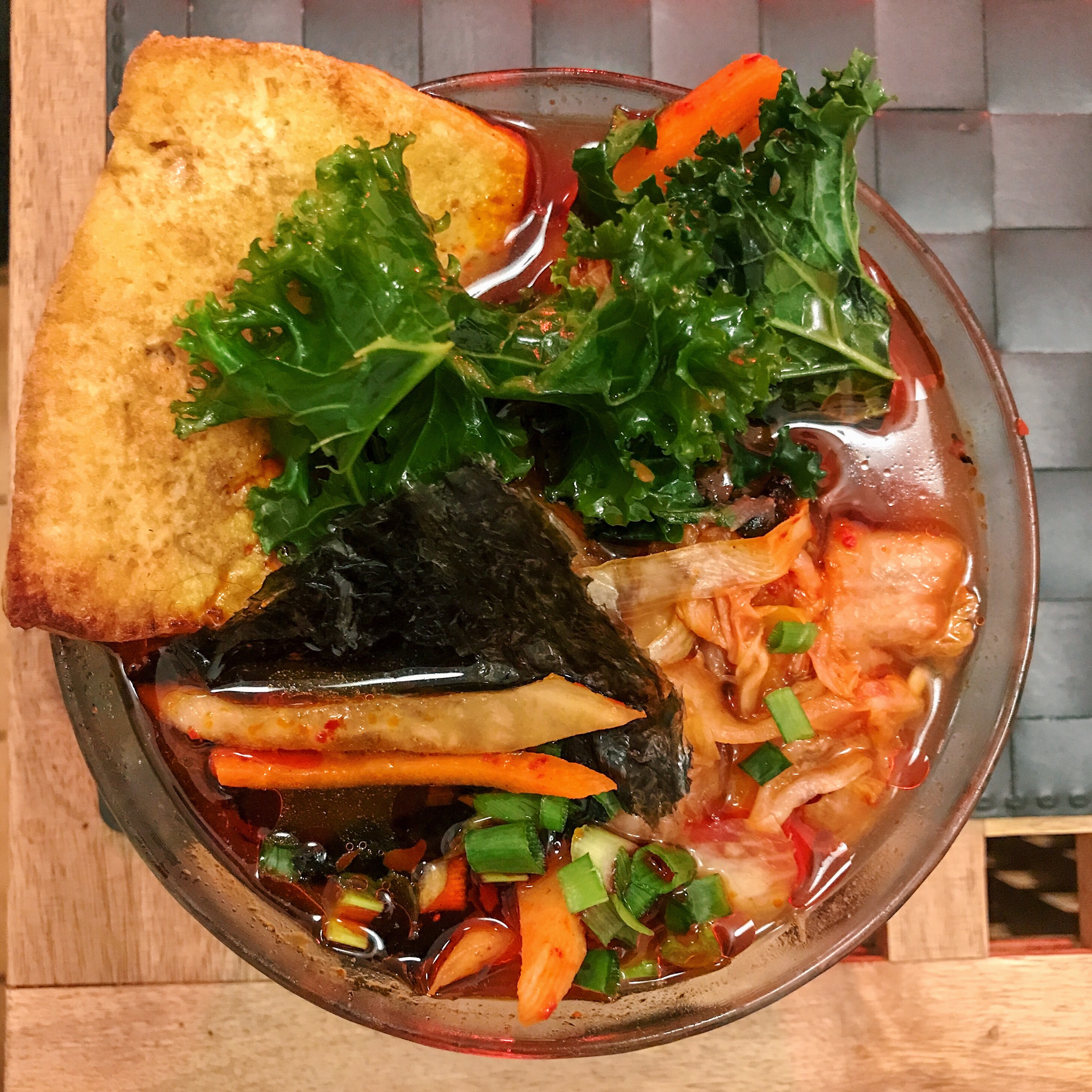 Mała zupka kimchi, a w niej dodatkowo jarmuż oraz smażone tofu